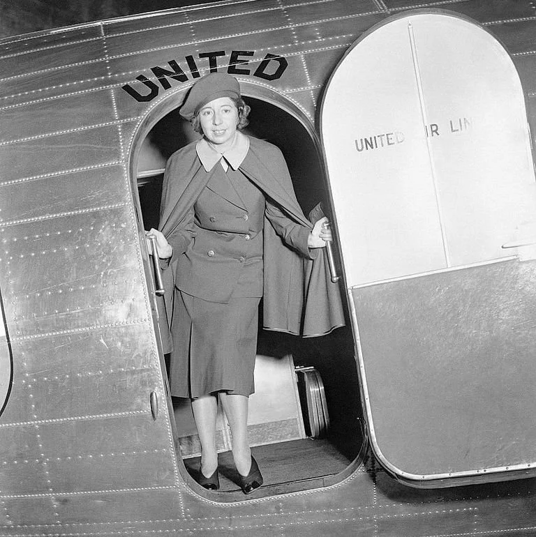 The first female flight attendant, Ellen Church, was a 25- year-old registered nurse who began working for Boeing Air Transport in 1930. Early flight attendants were all registered nurses and wore their nurse uniforms in the air to convey authority and relieve passengers’ fear of flying. Their uniforms were made of heavy, durable material in military-style and included large caps that covered their ears, capes, and skirts that fell below the knee.